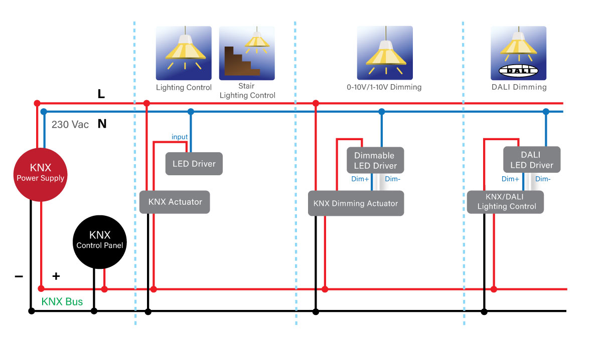 At this same time, with the development of information network technology, the KNX bus technology is becoming more and more mature, which has promoted the development of the intelligent building industry. Under the preconditions mentioned, the concept of an "intelligent lighting control system" emerged. The architecture of the system consists of a power supply that supplies the KNX bus. The KNX switch actuator is used to control the LED driver. With different input interfaces, you can control the light manually or adjust the light automatically. If a dimming function is required, an optional dimming switch actuator with a dimmable LED driver is expected.