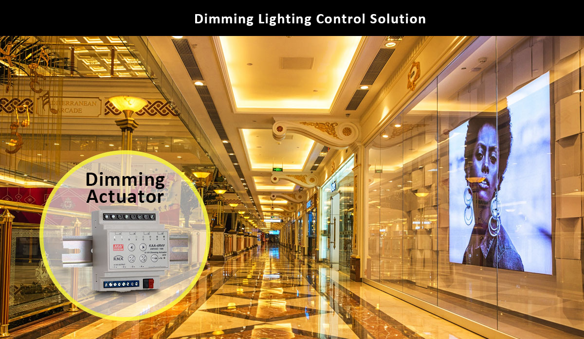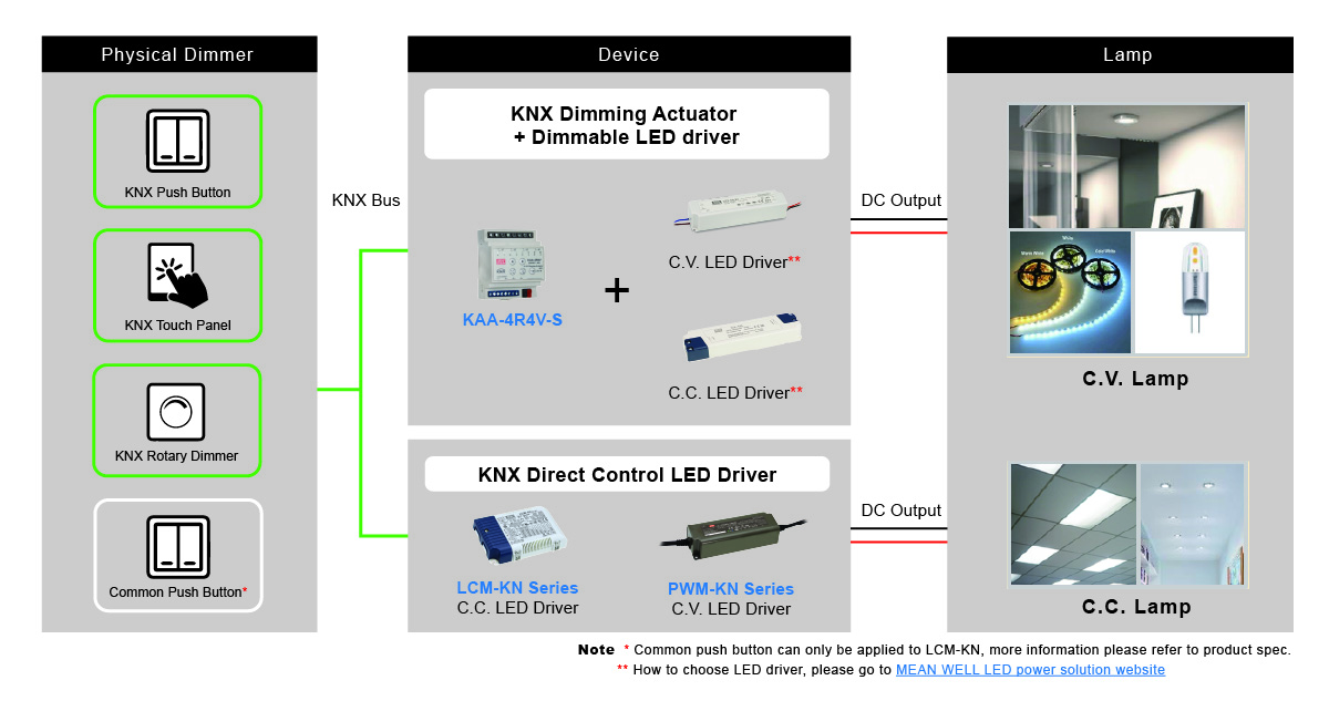 For example, to compose a dimming lighting system, users can select a KNX touch panel, matched with a KNX dimming actuator, connect to a dimmable Constant Voltage (C.V.) LED driver to dim and control a Constant Voltage (C.V.) driven LED strip.