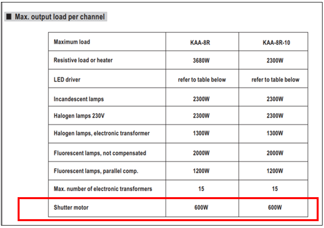 Users can get the Max. load information of different types of loads per channel in the KAA-8R product specifications. (As shown in the figure below)